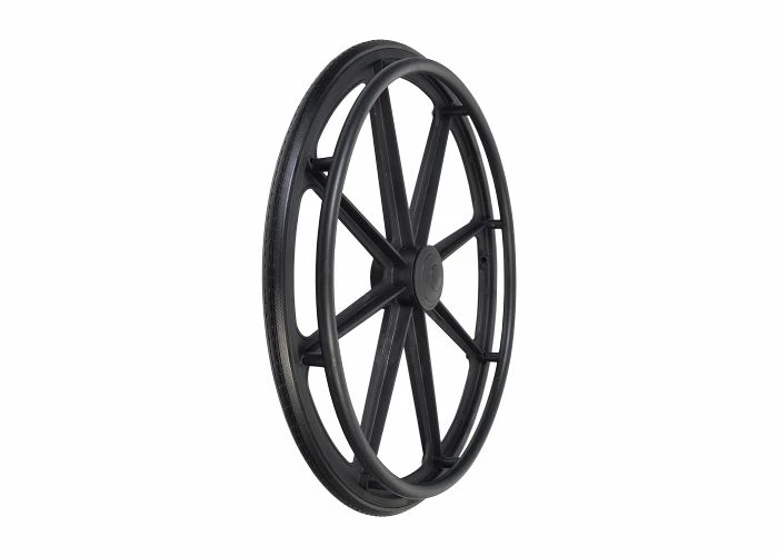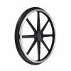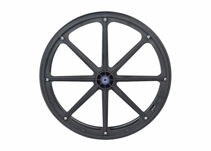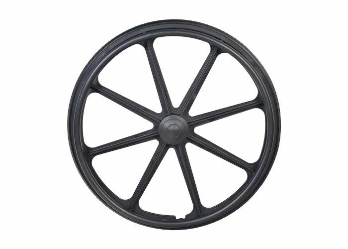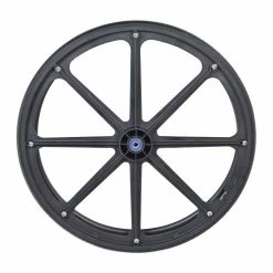 The 23″ wheel assembly with handrim and mounting hardware for the Invacare Mariner Shower Chair features a solid, treaded urethane tire.