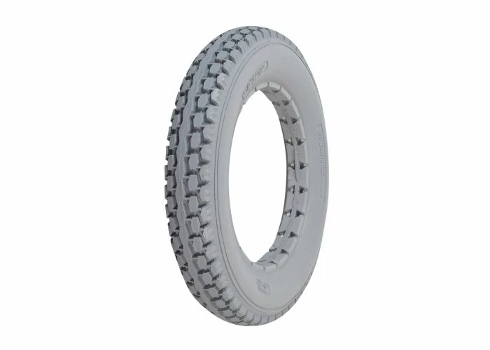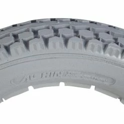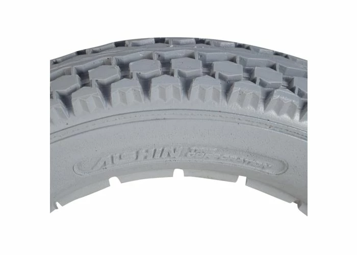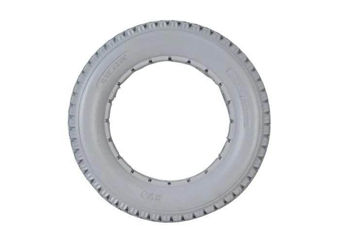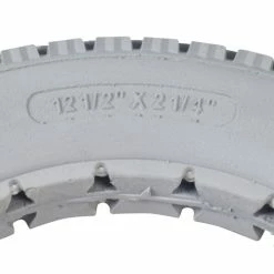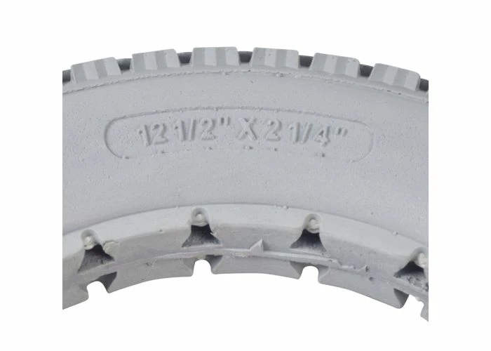 This 12-1/2″ x 2-1/” solid gray polyurethane mobility tire with knobby tread is made of solid light gray polyurethane