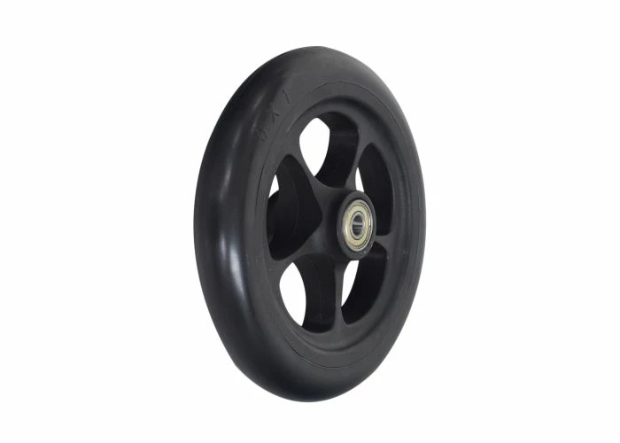 The 6″ caster wheel for the Pride Stylus LS manual wheelchair sports a 6″x1″ flat-free solid tire on a 5-spoke rim