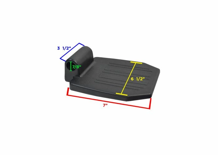 Most wheelchair brands and models use 7/8″ metal tubing to hold the swing-away footplates to the frame. This universal model was designed to fit easily on most footplate attachment tubes. In addition, this 7″ wide by 6″ deep black plastic footplate may be used on both the left side or the right side of the wheelchair.