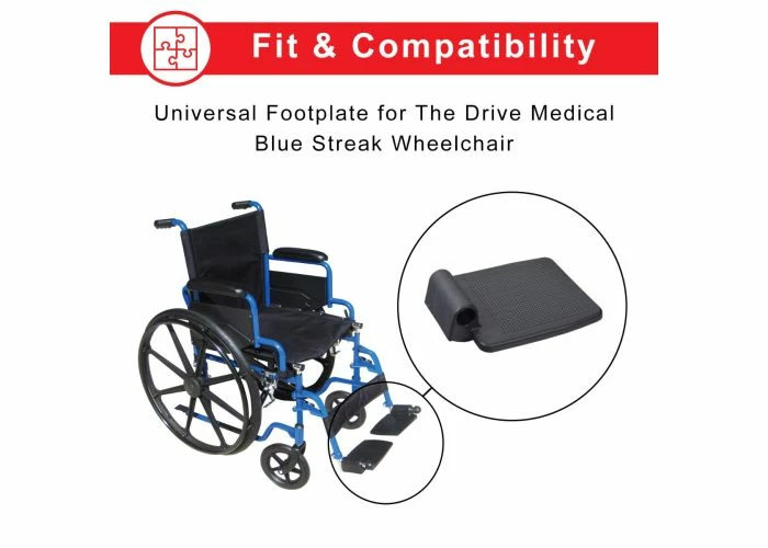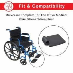 The footplate fit a wide variety of manual wheelchairs, including the Drive Medical Blue Streak wheelchair